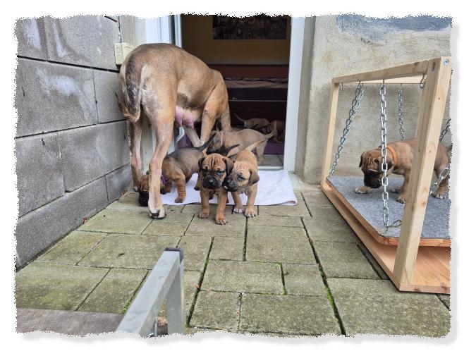 18.10.2025: Unsere I2-Wurf Babys sind heute 5 Wochen alt. In der letzten Woche haben sie fremde Menschen kennen gelernt, den Rasenmäher gehört und den Hof und den Auslauf neugierig erkundet. Das alte Wackelbrett und das neue Hängebrett finden sie toll! Auch auf das luftgefüllte Gummikissen finden sie interessant zu erklettern. Nun gibt es auch wieder einen Welpentunnel, den sie schnell gut fanden, wie man im Video sehen kann. Sie haben nun den Schlafplatz hinter dem Bett und neben der Kommode als ihren Hauptschlafplatz auserkoren, wie auch die vorherigen Würfe. ;-) Mama Aliah schläft derzeit noch unten bei den Babys, aber ab dem Wochenende darf sie oben im Wohnzimmer schlafen, denn sie hat keine Lust mehr die Hinterlassenschaften der Welpen wegzumachen. Ab dem kommenden Montag werden sie auch ins Holzhaus umziehen und dann können sie ihre Geschäfte im Auslauf erledigen. :-) Sie bekommen nun 4 Mahlzeiten und zwischendurch einen kleinen Milchdrink von Mama Aliah. Diese Woche hatten alle Durchfall. Mama Aliah hat wohl einen Keim von außerhalb mitgebracht. Sie hatten zwei Tage Durchfall und haben damit ihr Immunsystem trainiert. ;-) Dieses Wochenende werden die Kleinen viel Besuch bekommen und ihre neuen Familien kennen lernen. Wir sind schon ganz gespannt! ;-) Es gibt wieder neue Bilder von den Kleinen in ihren Galerien (hier klicken) und auch wieder Videos (Video1 + Video2).